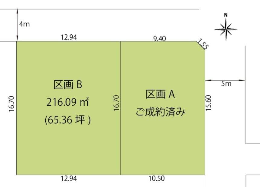 | 備考 | ※面積・寸法は分筆後に確定します。 区画Ⓑ 上水道宅地内引込なし/下水道宅地内引込なし ※区画Ⓑは上水道引込の際に前面道路下の上水道管共同利用者の同意を要します。 ※消雪負担金4,000円/年、居住時に井戸設置に係る一時金10万円(1回のみ) ※区画Ⓑ上の樹木類撤去売主負担。 |