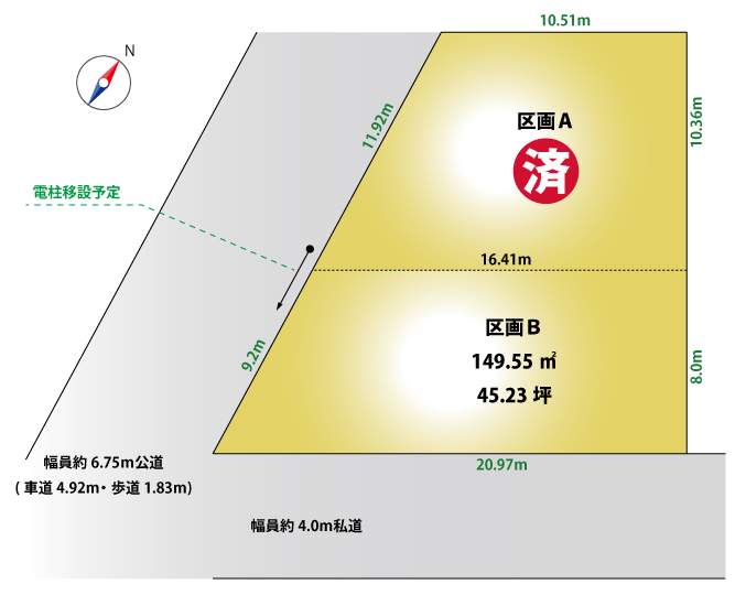 | 備考 | 面積は実測後の変更が生じる場合有、分筆後の引渡しとなります。 西側公道は都市計画道路です。 |