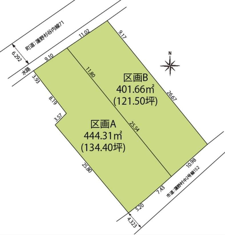 | 土地面積 | 区画A 444.31㎡(134.40坪) 区画B 401.66㎡(121.50坪) |